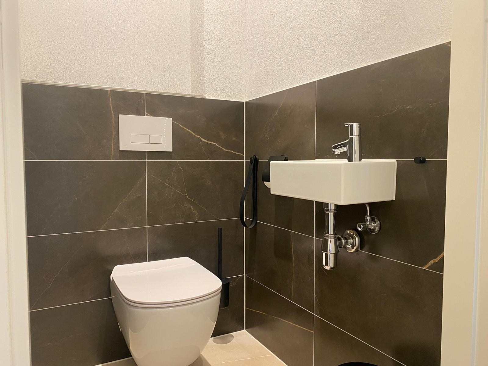 De toilet is gedeeltelijk betegeld en voorzien van fontein en hangend toilet.