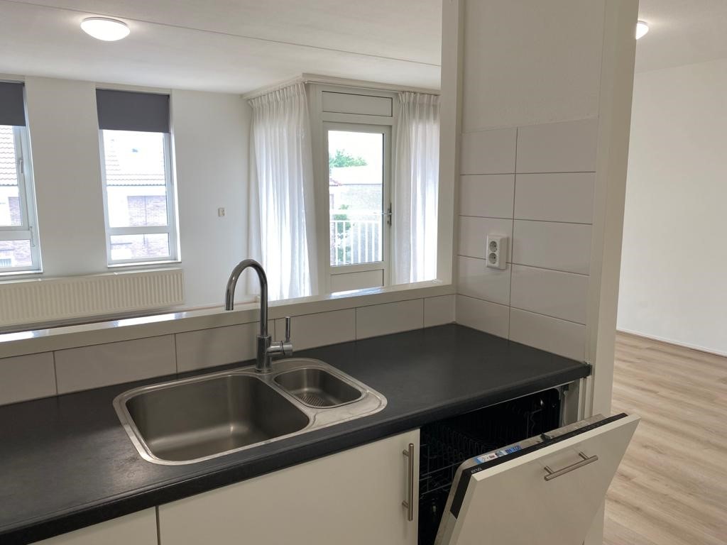 Ruime lichte woonkamer met laminaat vloer. Halfopen keuken in hoekopstelling met inbouwapparatuur, zoals combi oven magnetron, koel- en vries combinatie, elektrische kookplaat en vaatwasser.