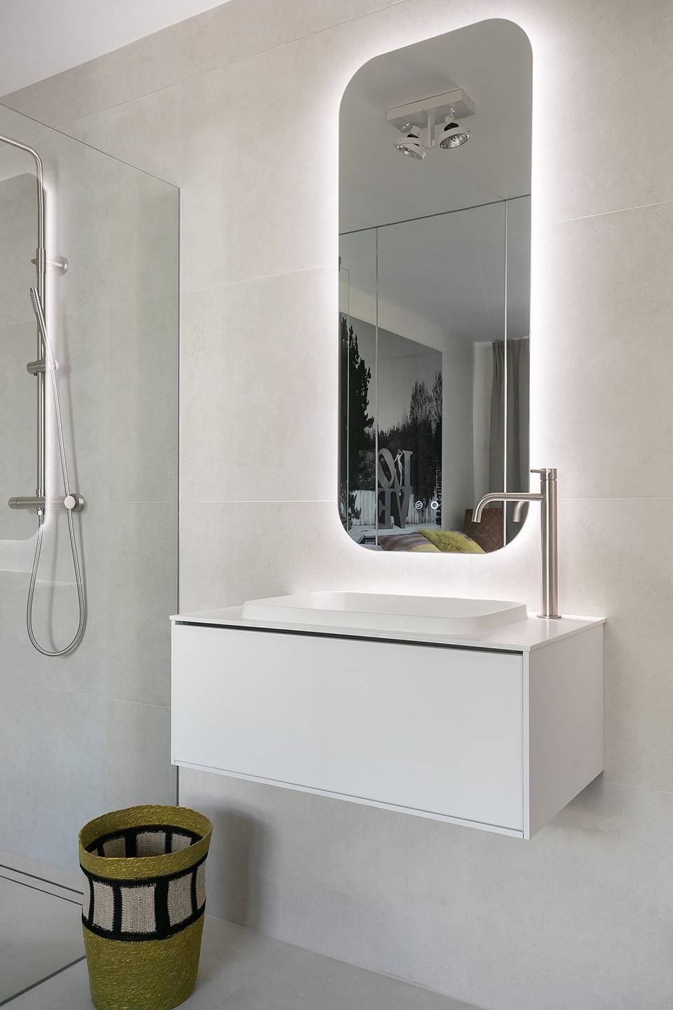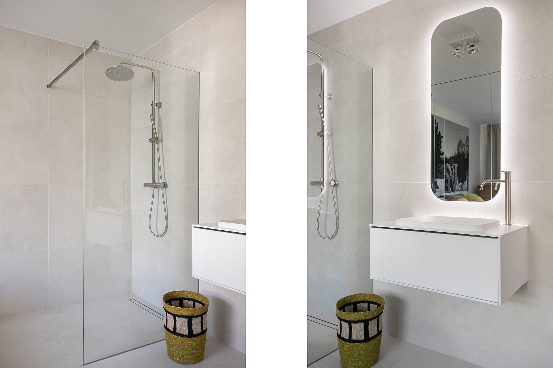 Badkamer met inkoopdouche en badmeubel/wastafel.
