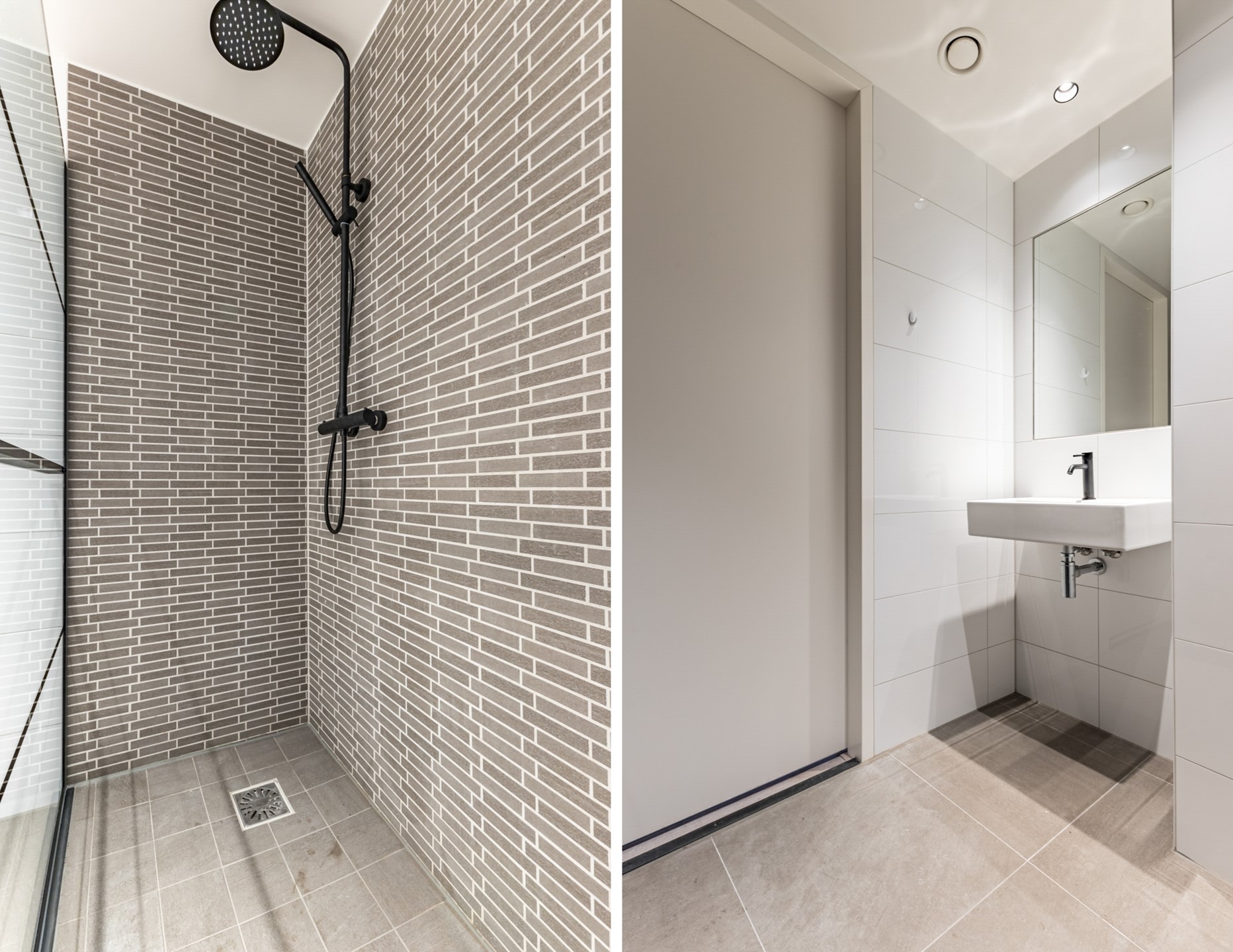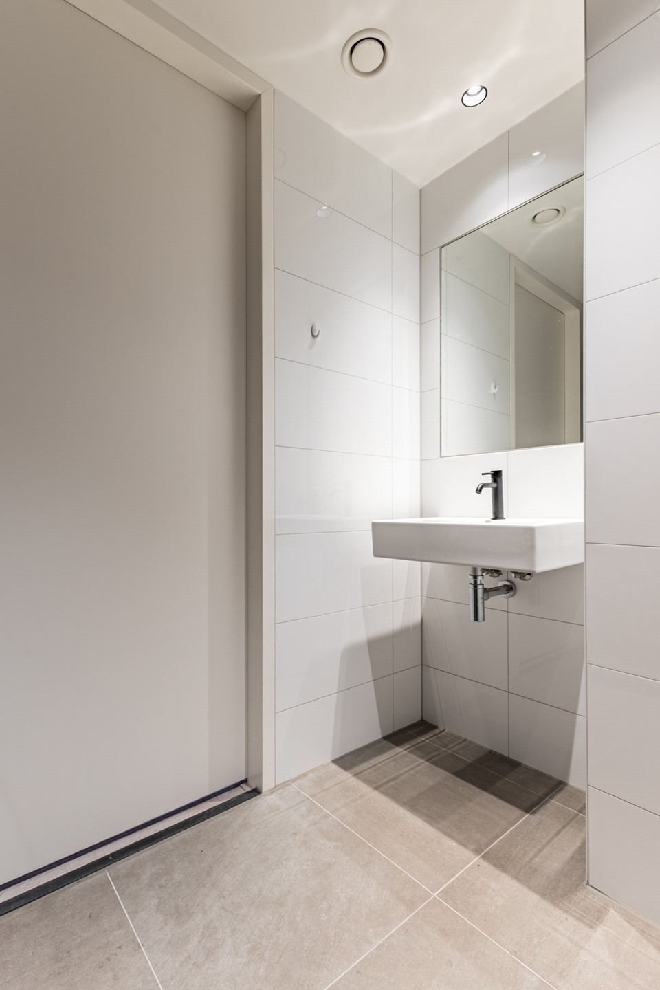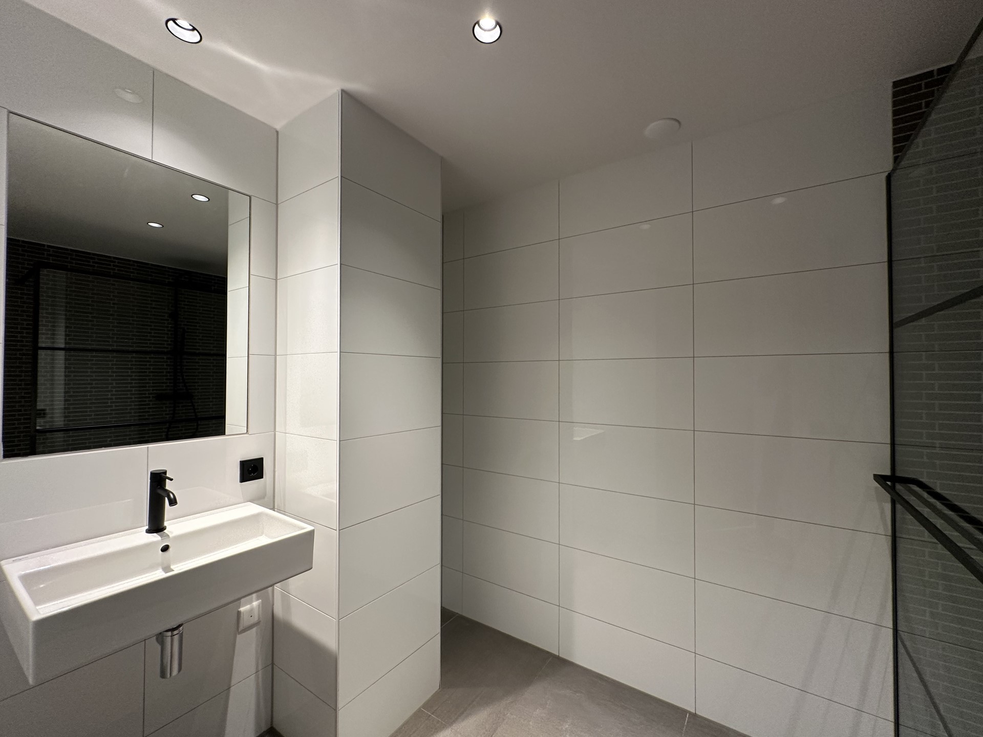 De badkamer is centraal gelegen in de woning. Deze ruimte is praktisch ingedeeld met onder andere ruimte voor een wastafel en inloopdouche.