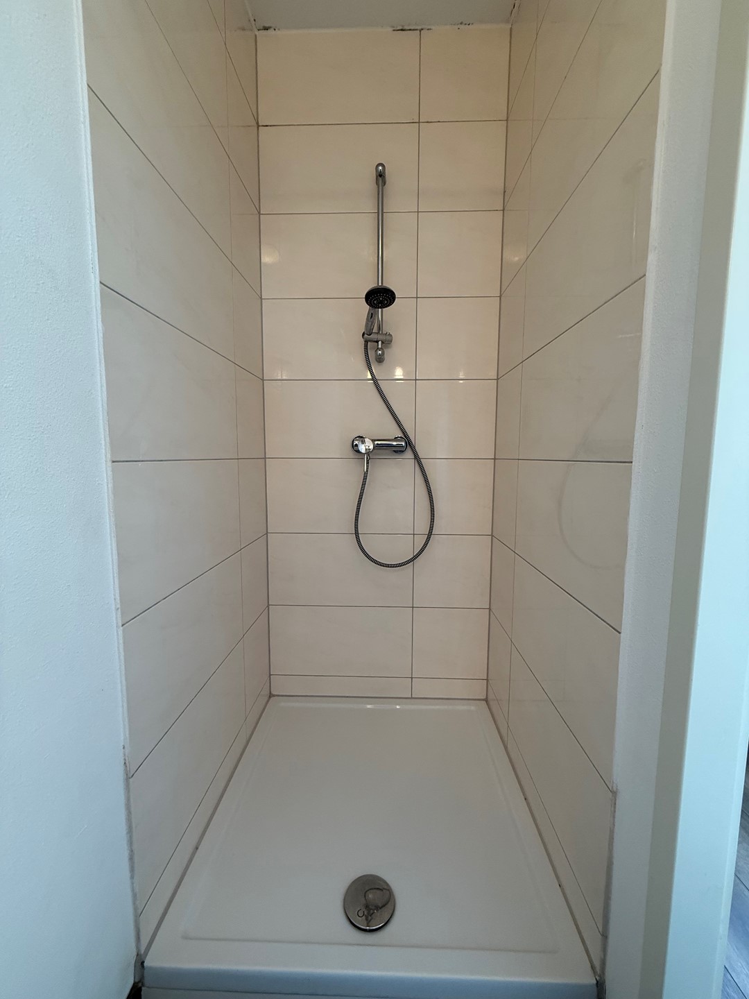 Betegelde badkamer met douche en badmeubel.