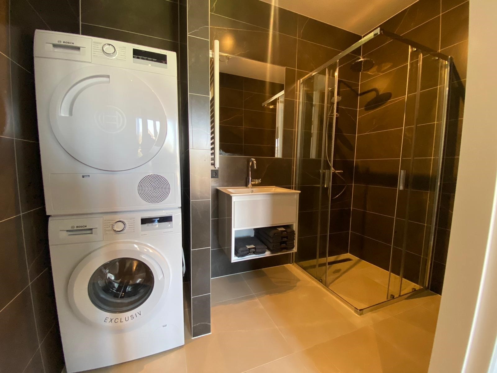 De moderne badkamer is voorzien van een ruimte douche, wastafelmeubel met opbergruimte, wasmachine en droger. Door de grote vloertegels en donkere wandtegels heeft de badkamer een luxe uitstraling.