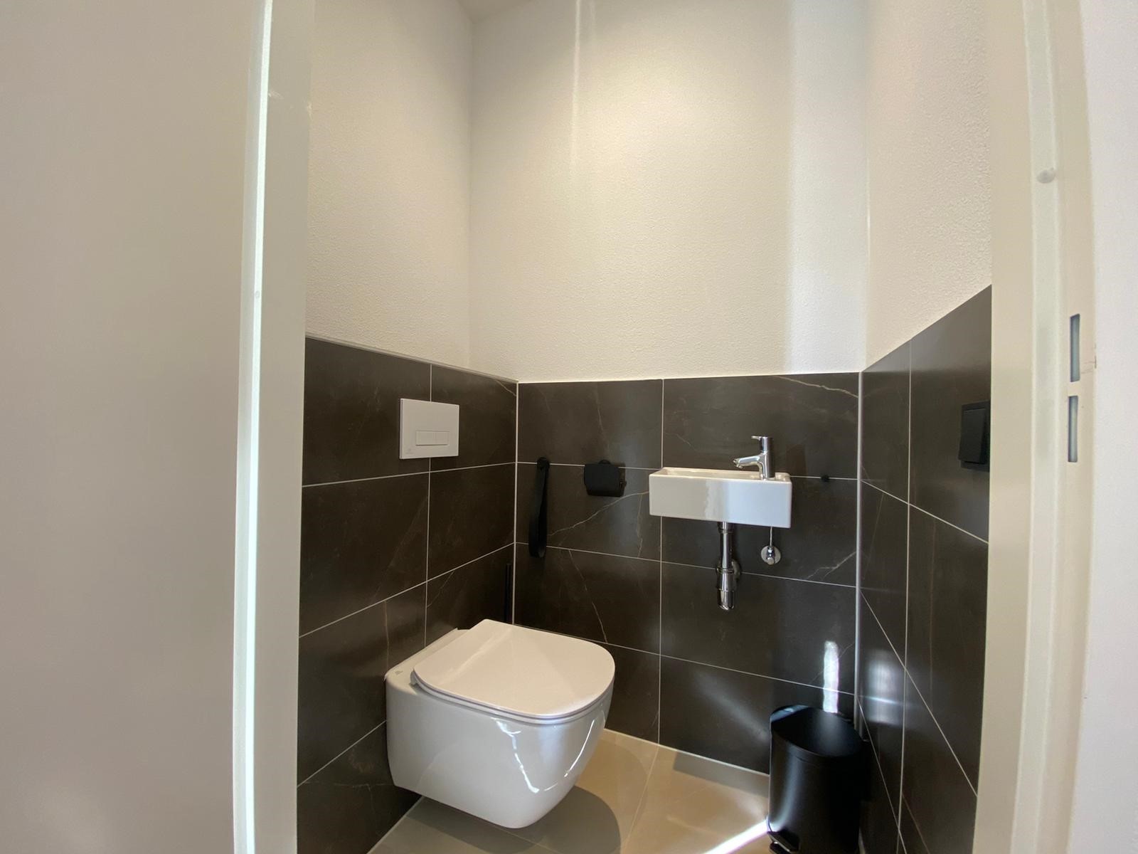 De toilet is gedeeltelijk betegeld en voorzien van fontein en hangend toilet.