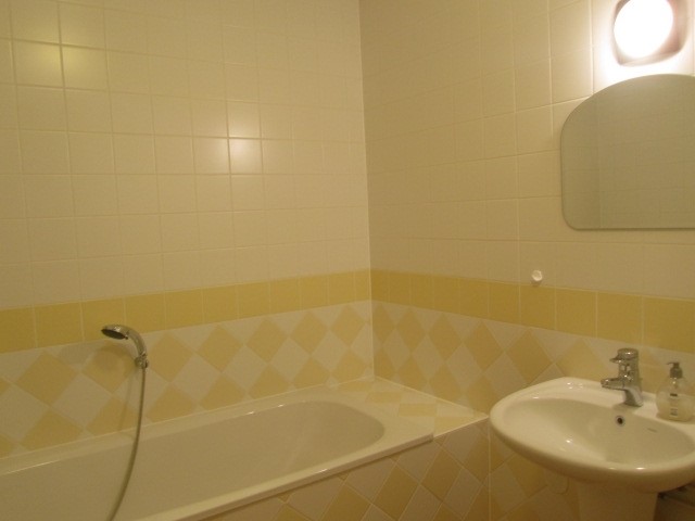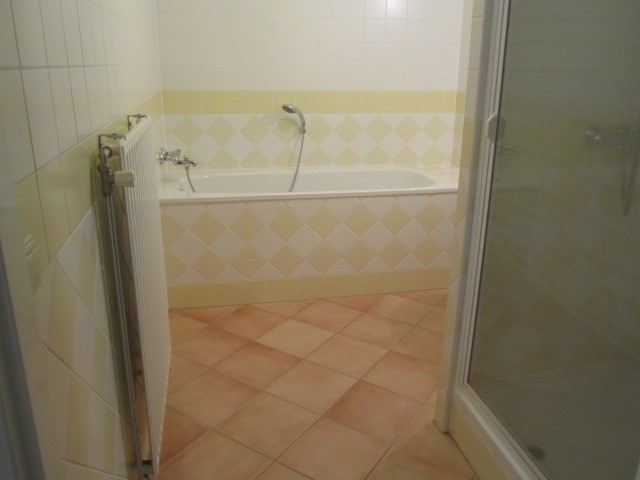 Nette betegelde badkamer met o.a. ligbad, separate douche en vaste wastafel.