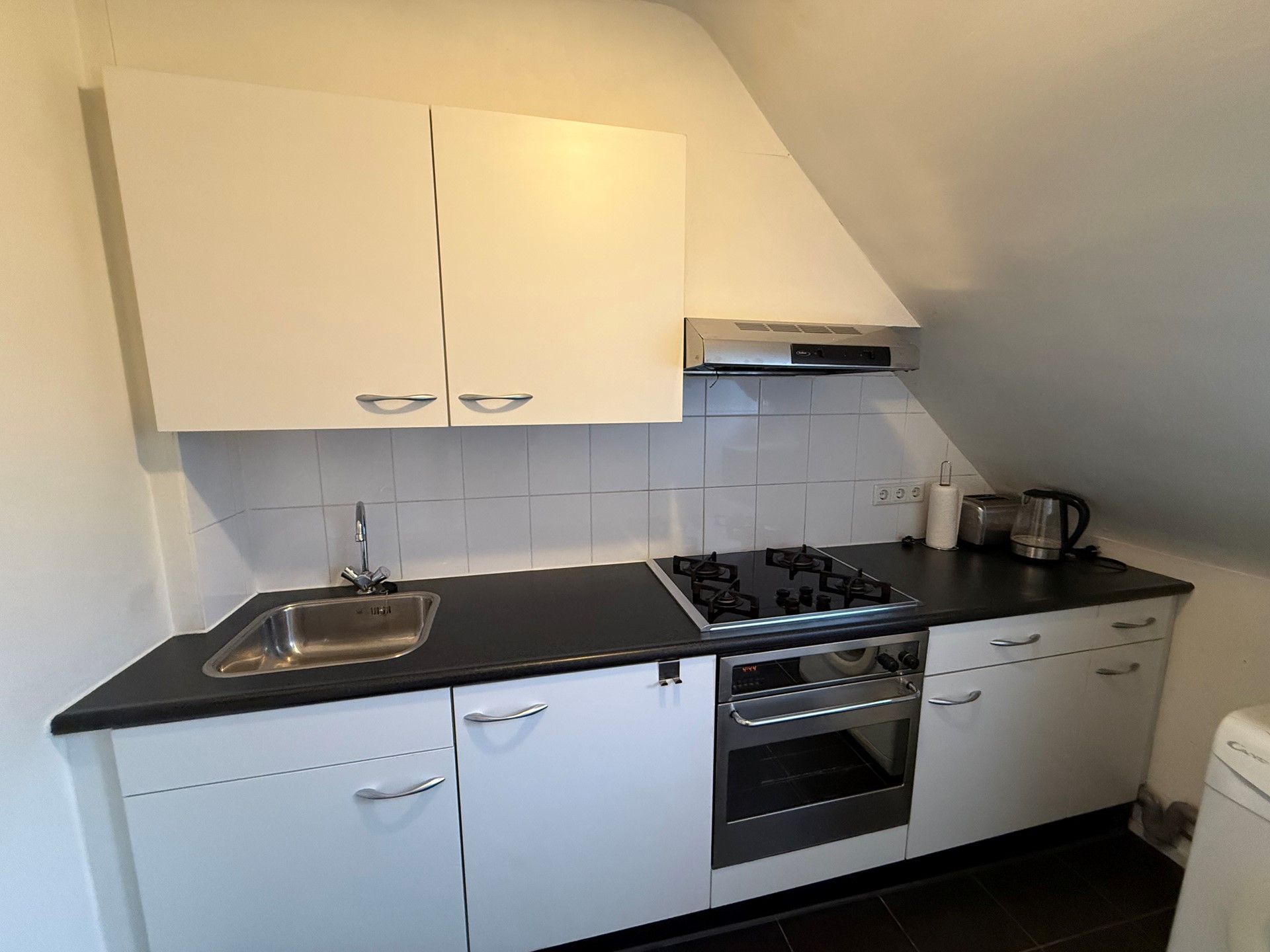 Afgesloten keuken met gaskookplaat, oven, koelkast en wasmachine/droger. Vloer v.v. tegels.
