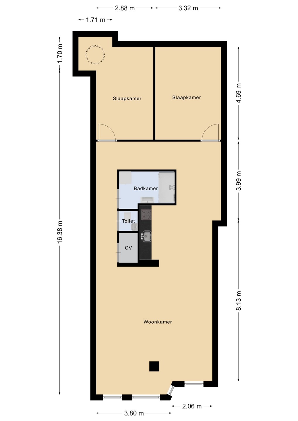 - De totale lengte van het appartement is ca. 16,38 m, wat zorgt voor een ruime, langgerekte indeling.