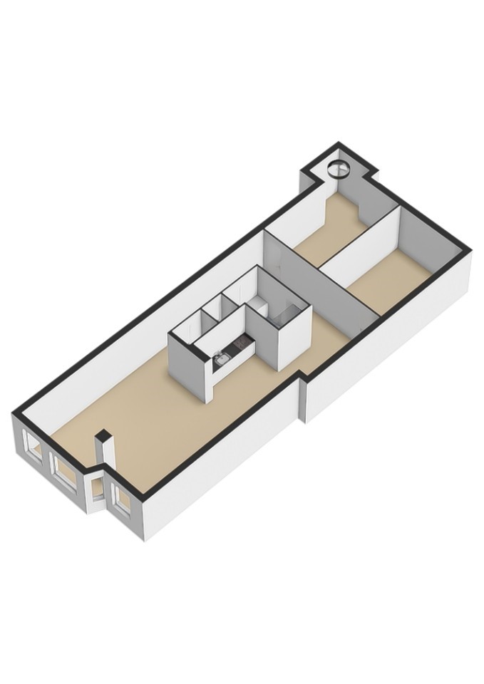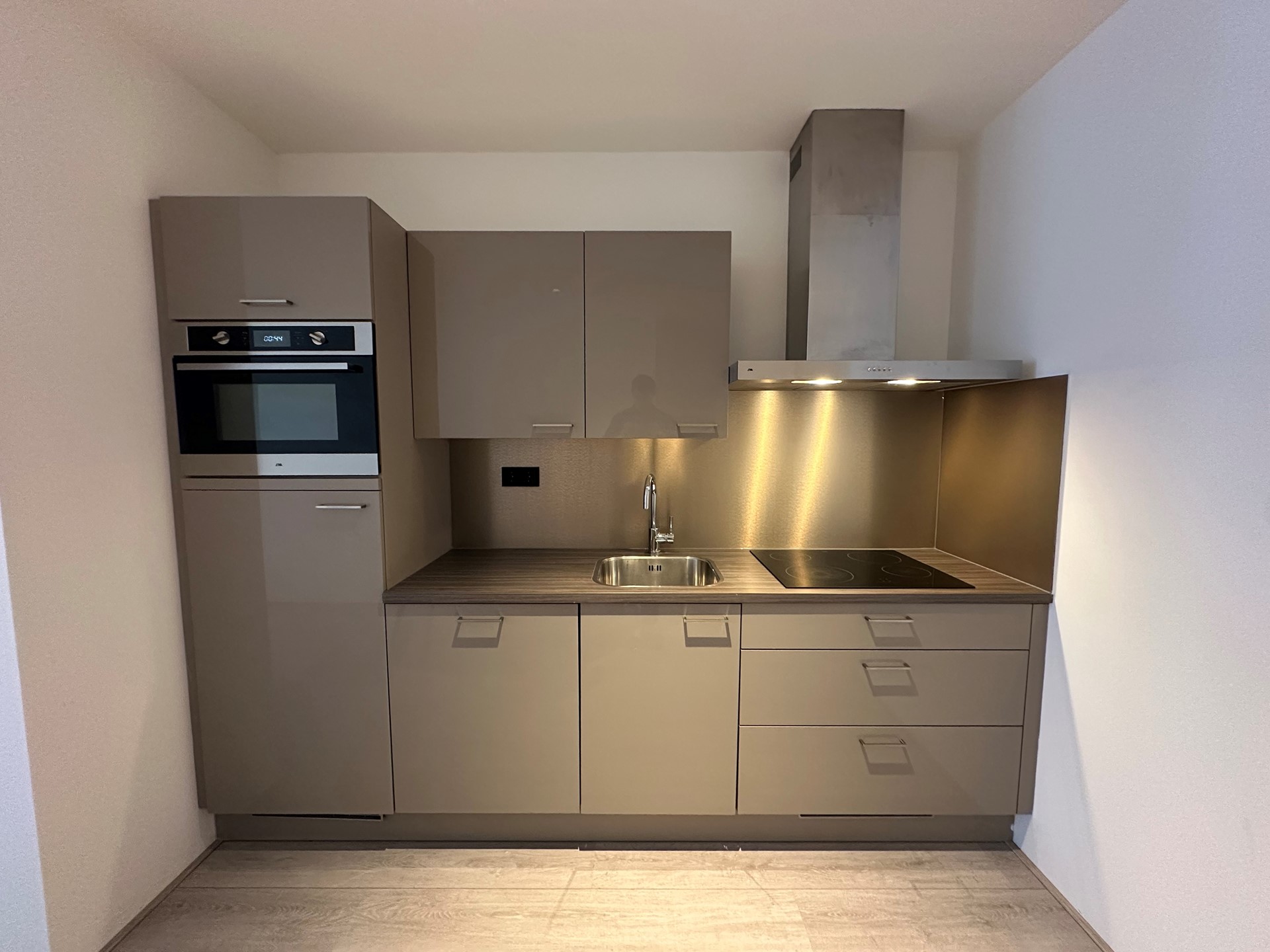 De keuken is geïntegreerd in de woonkamer en bevindt zich in het midden van de woning. Deze is in een rechte opstelling geplaatst langs een wand, tegenover het toilet en de CV-ruimte.