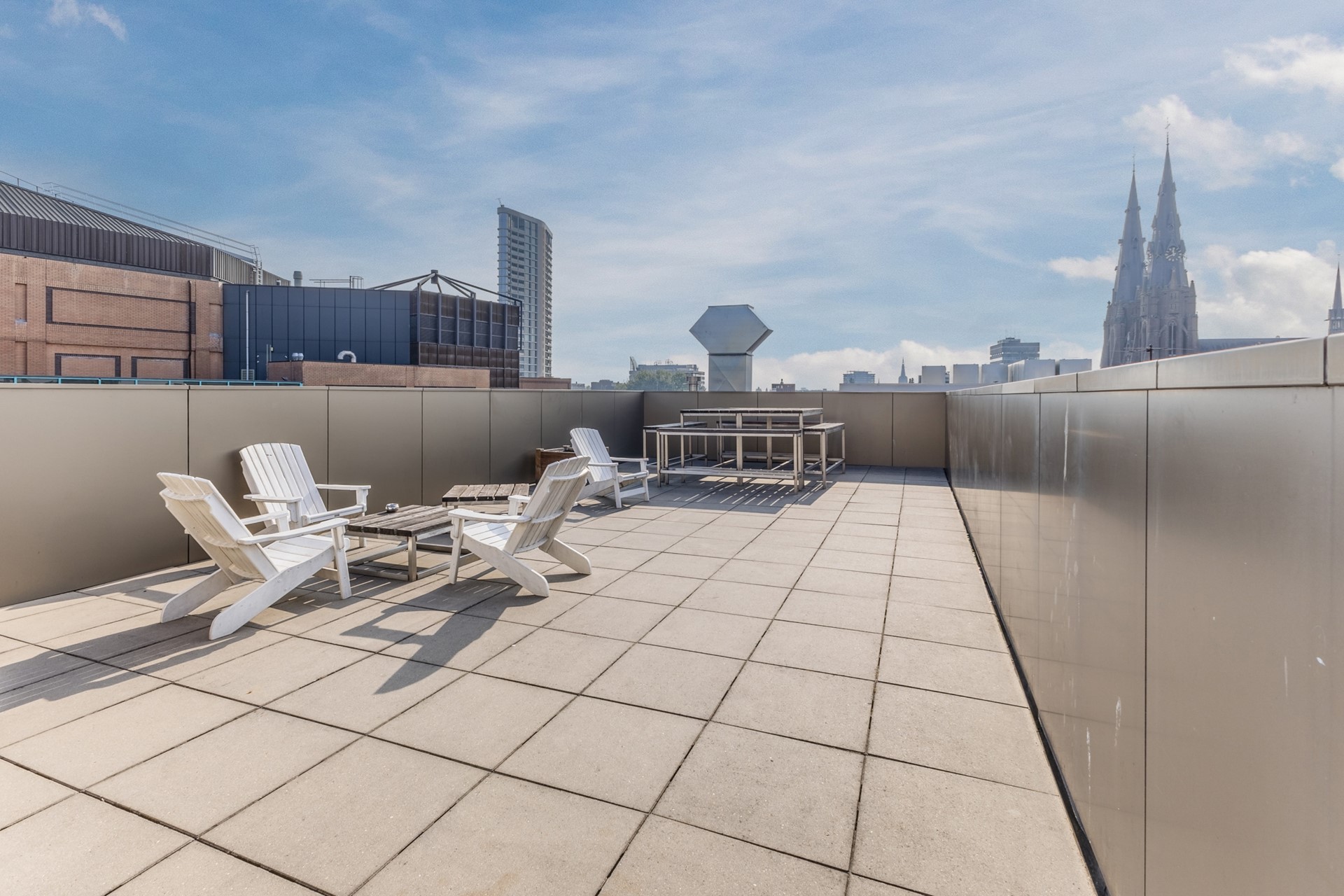 Naast je eigen appartement kun je genieten van het ruime, gemeenschappelijke dakterras. De ideale plek om te ontspannen, een boek te lezen of gezellig met vrienden een drankje te doen, terwijl je uitkijkt over de skyline van Eindhoven.