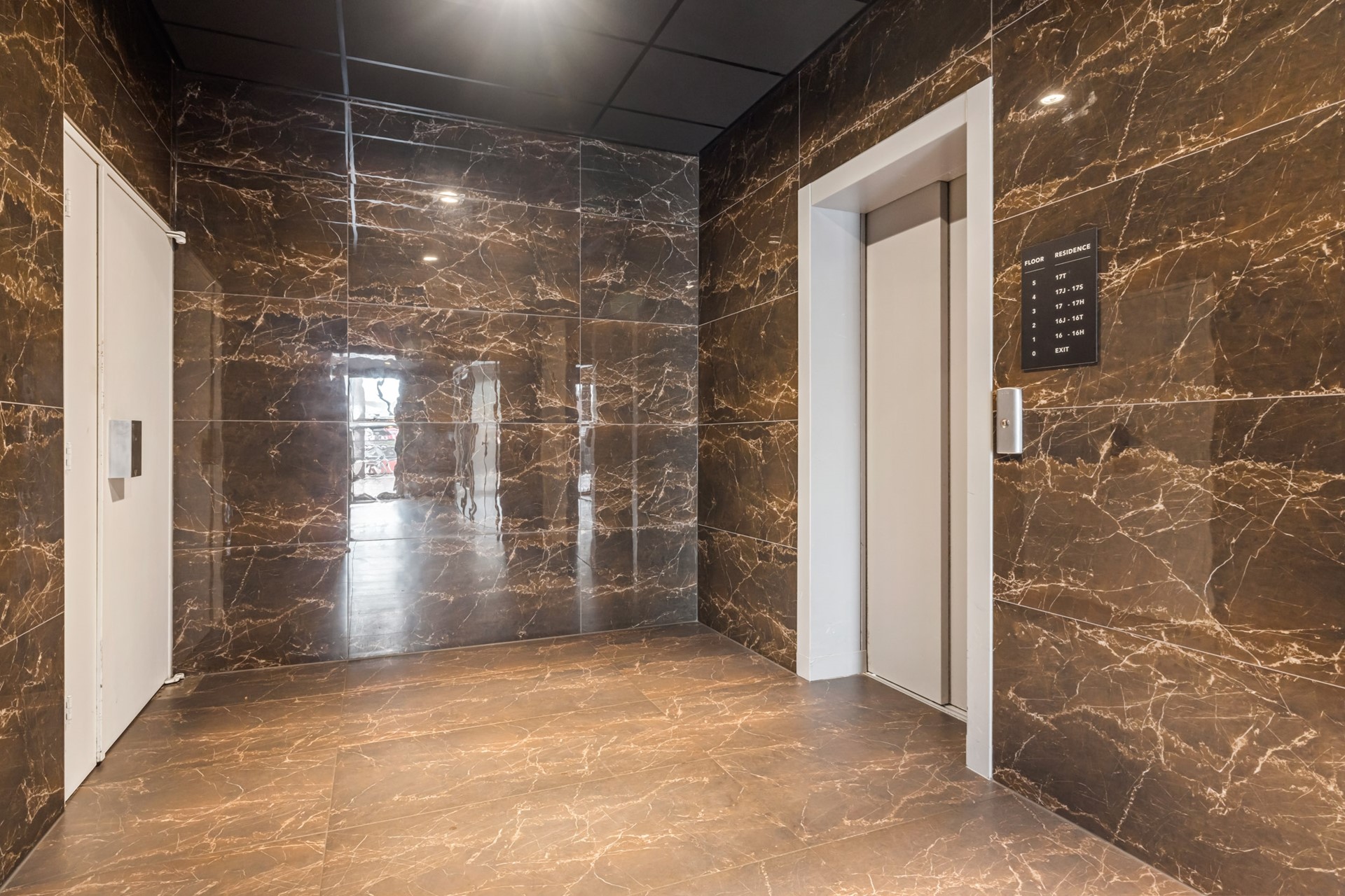 In het centrale middenblok bevindt zich de volledig betegelde badkamer. Deze is uitgerust met een ruime inloopdouche, wastafel en een aansluiting voor een wasmachine. De badkamer is functioneel ingedeeld en onderhoudsvriendelijk afgewerkt.