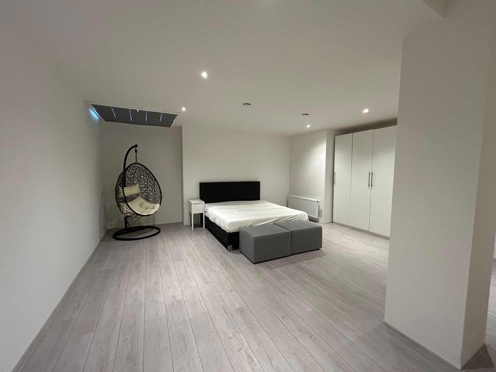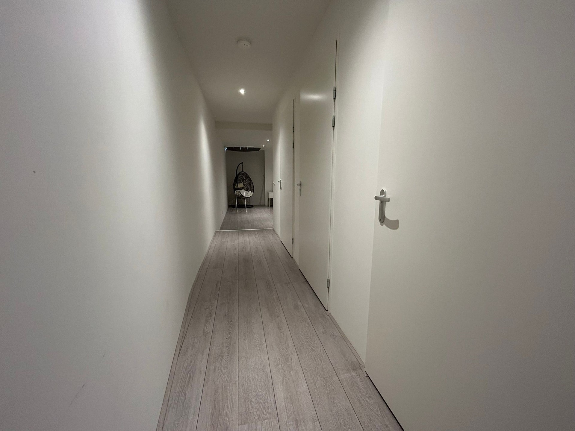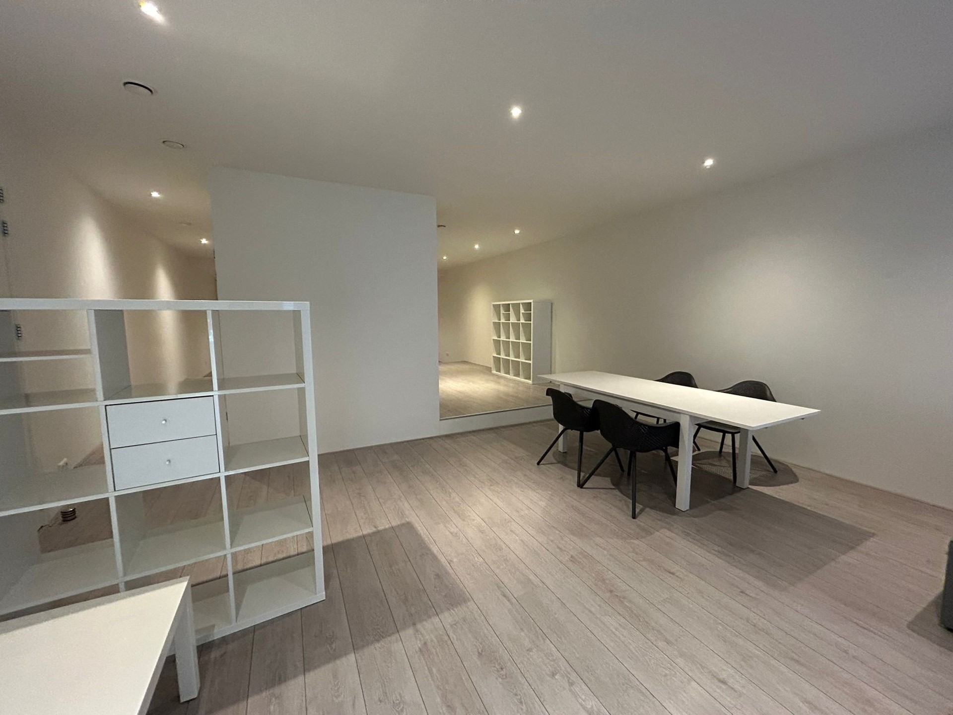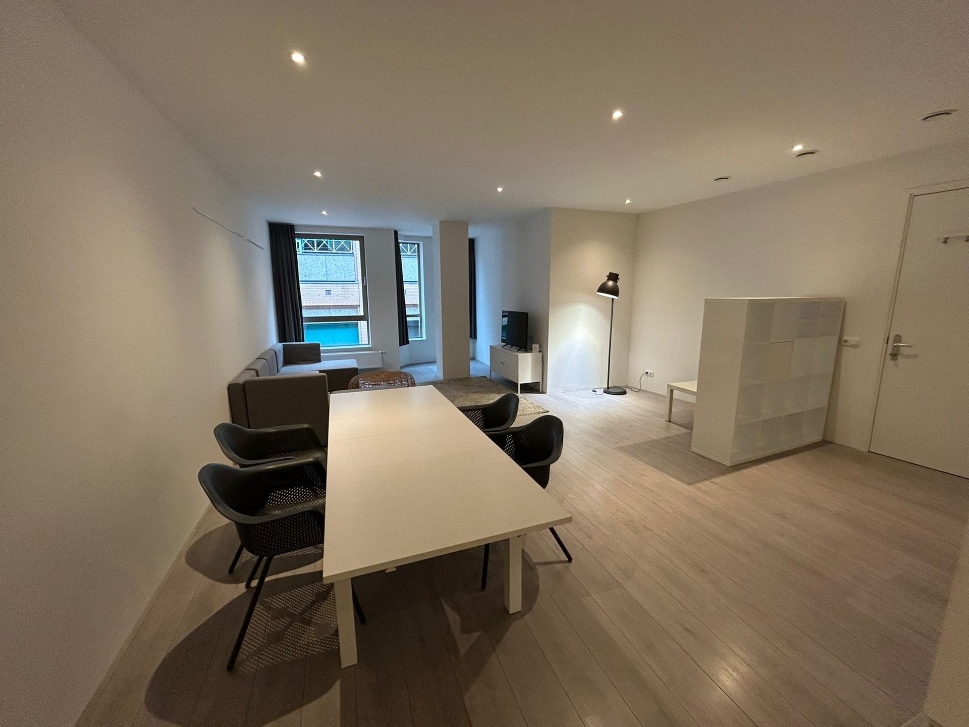 De ruime woonkamer vormt het hart van de studio en biedt voldoende mogelijkheden voor zowel een comfortabel zitgedeelte als een aparte eethoek. Dankzij de grote raampartijen geniet de ruimte van veel natuurlijk licht en een uitzicht op de winkelstraat, wat zorgt voor een levendige en stedelijke sfeer.