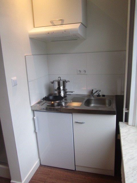 Kitchenette met koelkast, elektrische kookplaat en opbergkast. Douche en wastafel.