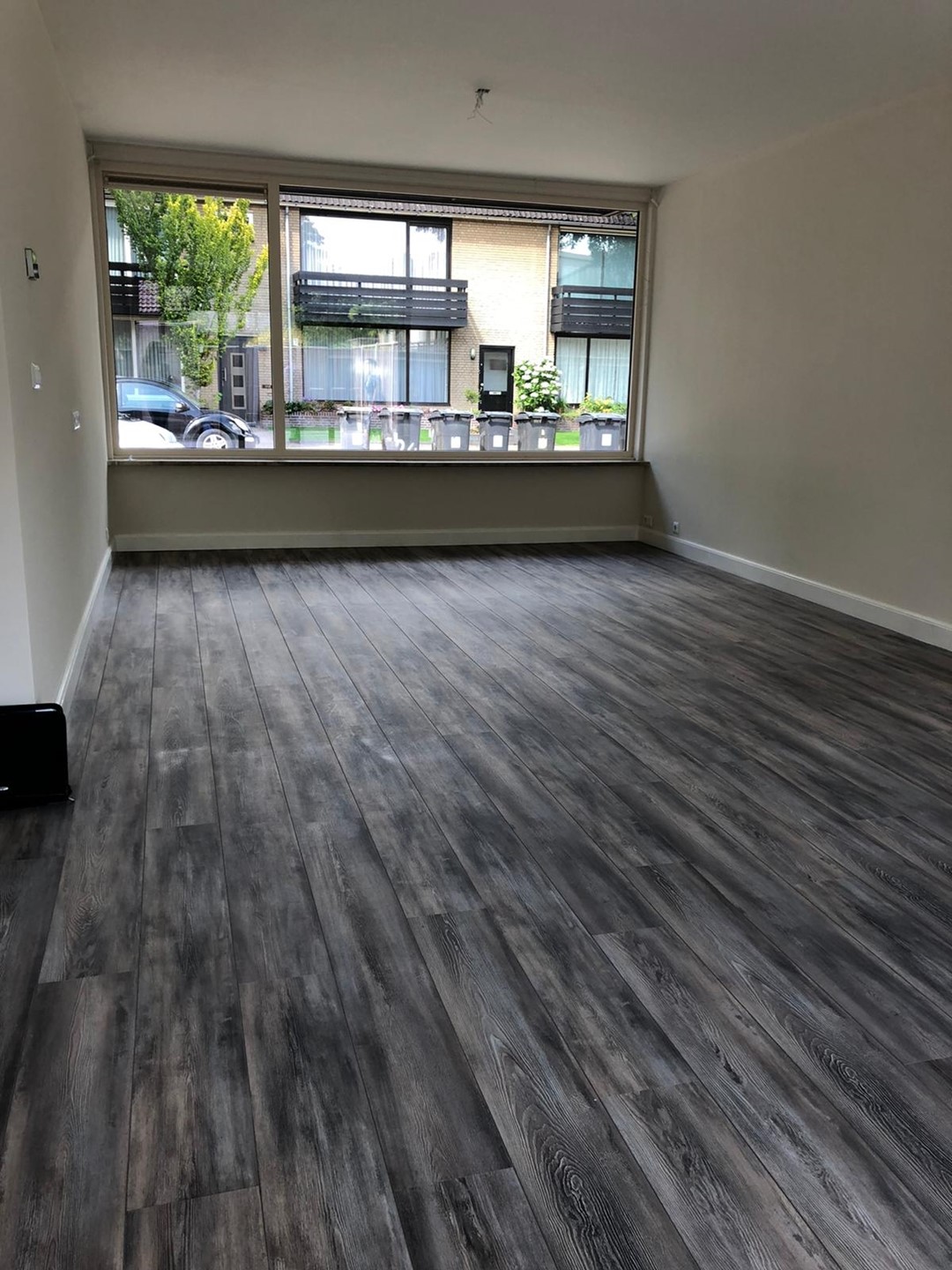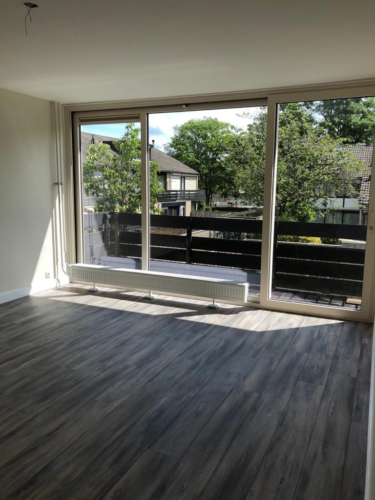 Royale living, voorzien van laminaat vloer, stucwerk wanden, spuitwerk plafond, de raampartij aan de voorzijde en grote schuifpui (volledig nieuwe aluminium kozijnen) aan de achterzijde zorgen voor een prettige lichtinval.