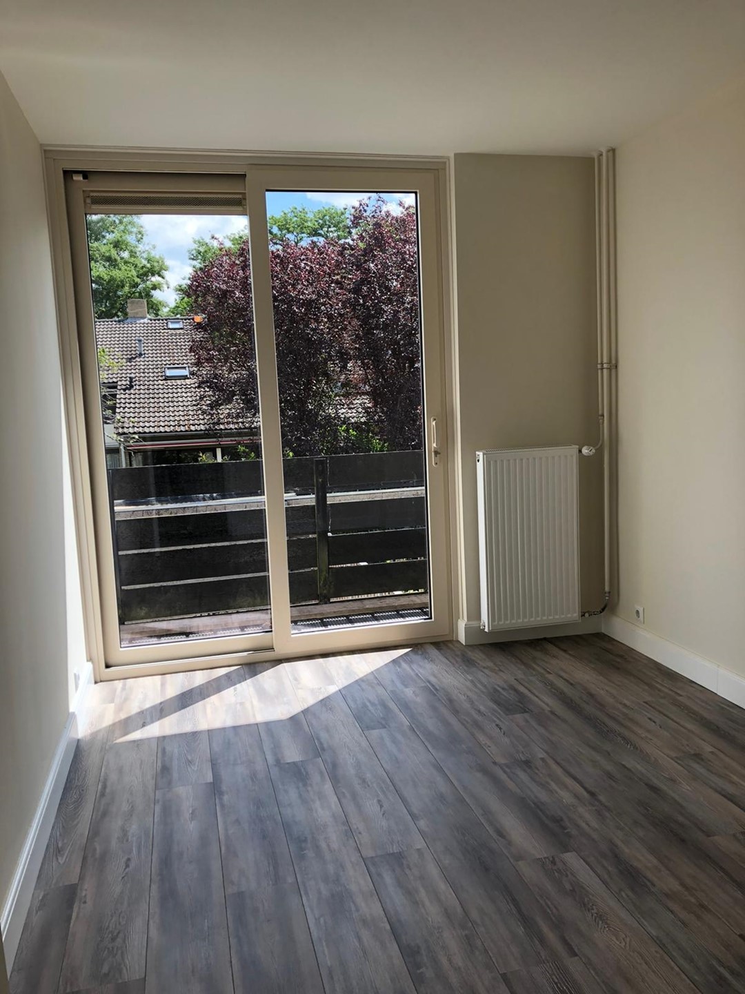 Slaapkamer I: gelegen aan de achterzijde, voorzien van laminaatvloer, stucwerk wanden en een grote schuifpui naar balkon.