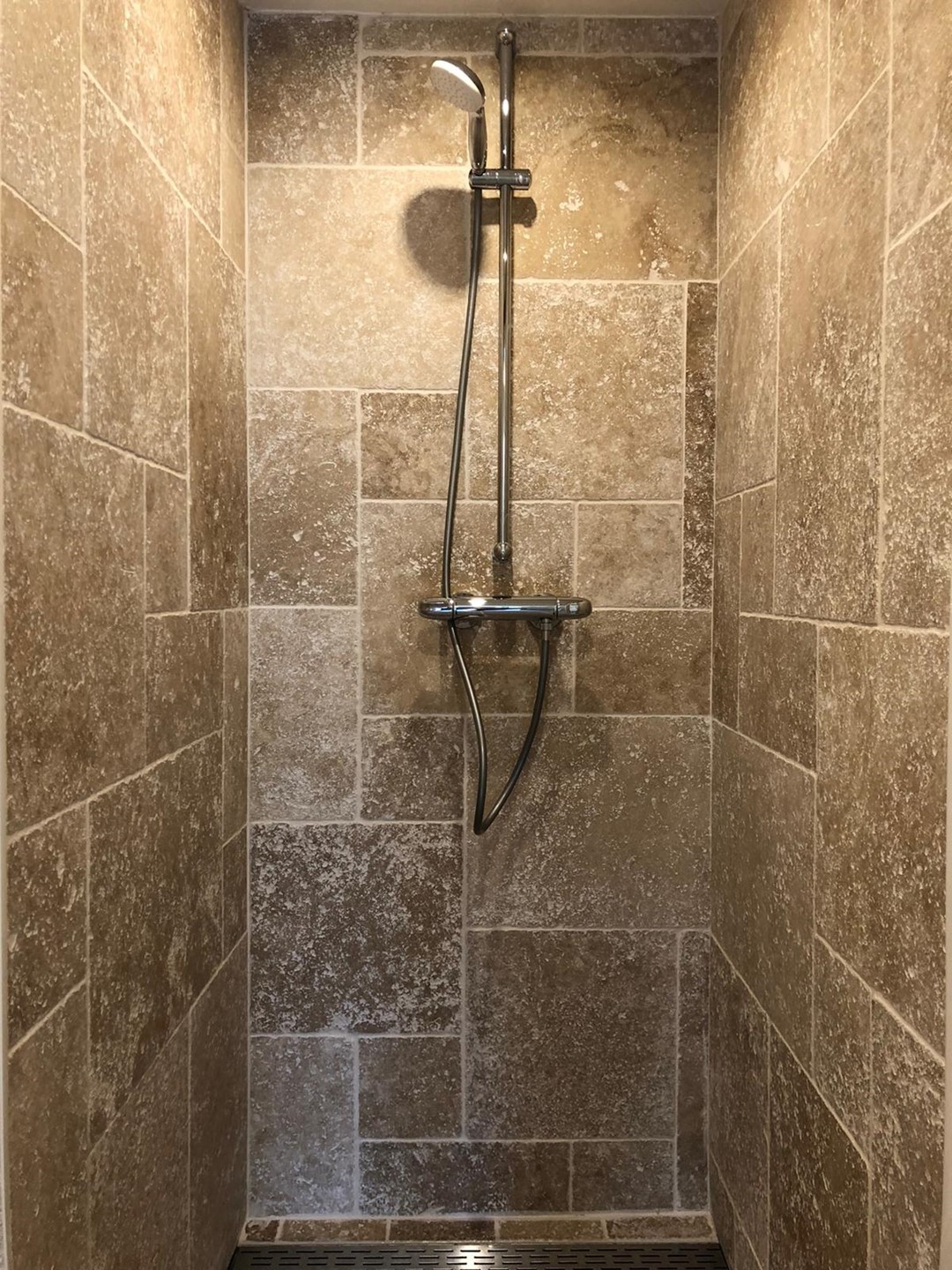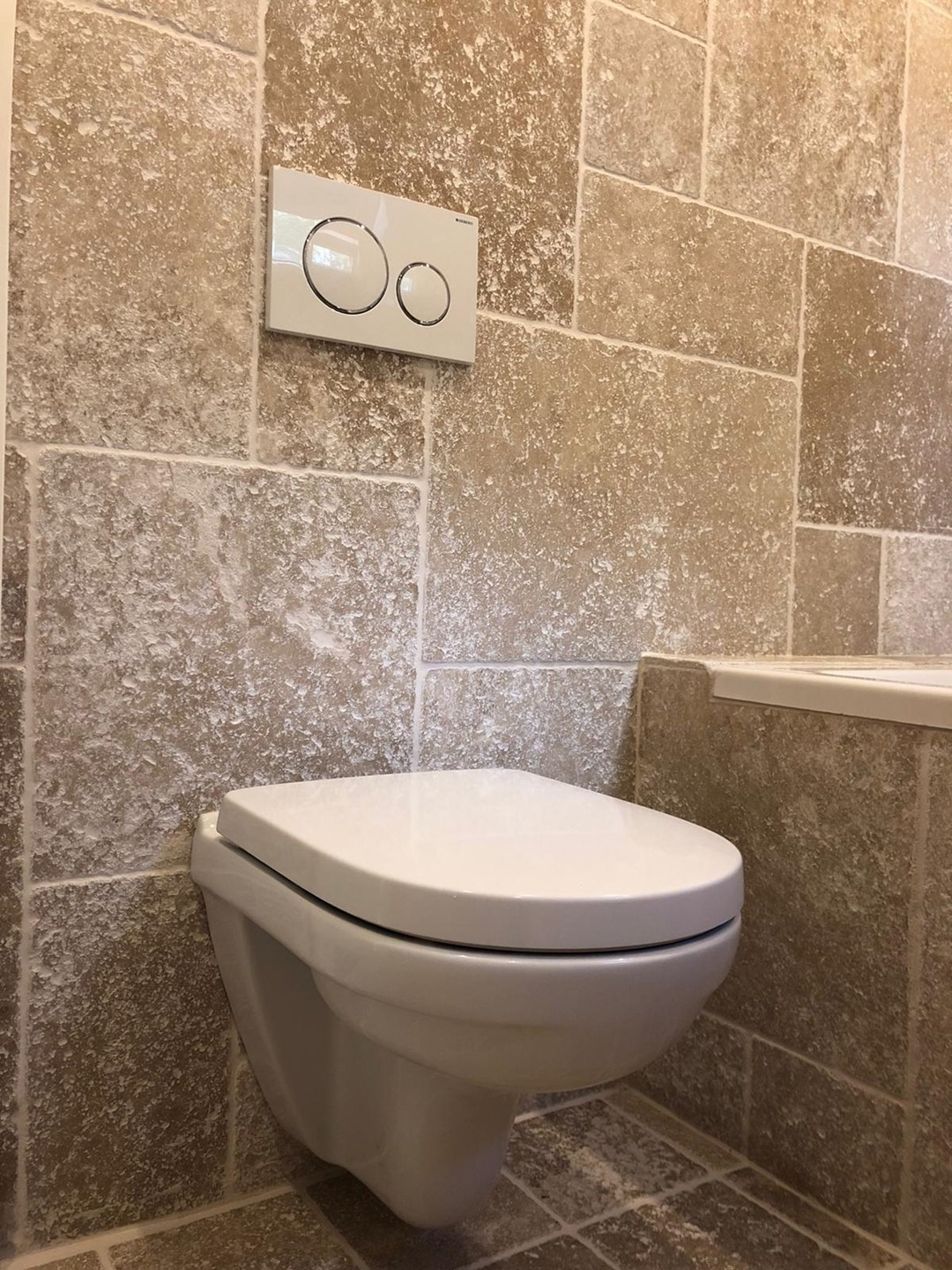 Geheel betegeld en voorzien van hangend closet, fonteintje en plafond met inbouwspots.