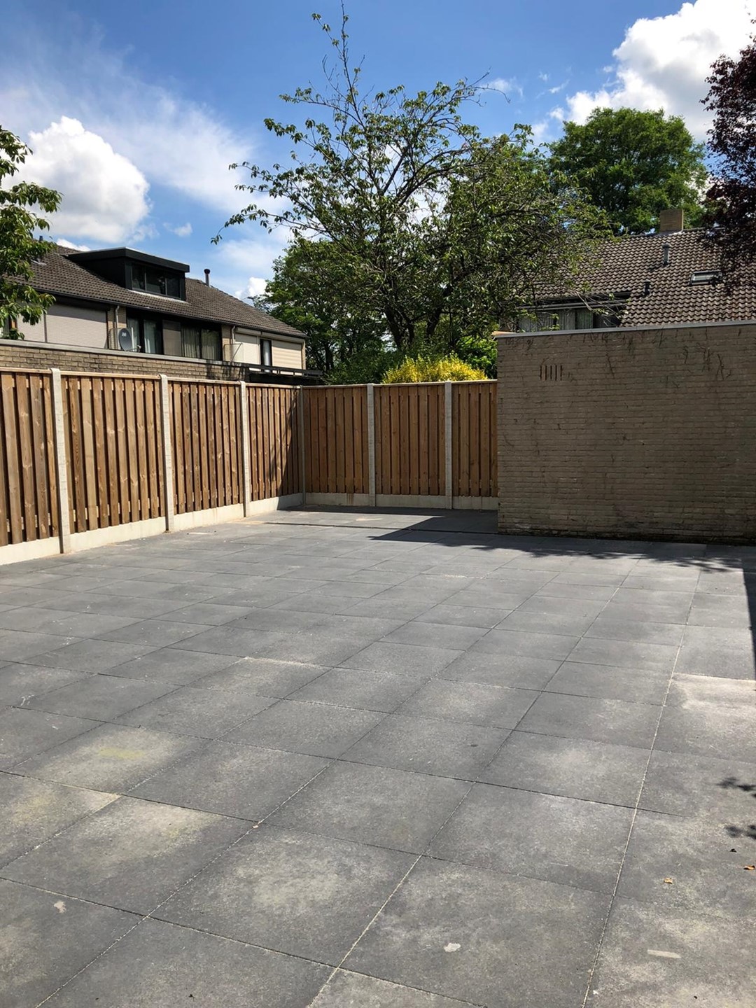 Strak aangelegde en onderhoudsvriendelijke achtertuin, buitenkraan + putje, houten schutting aan beide zijden, poort naar achterom en ruime berging.