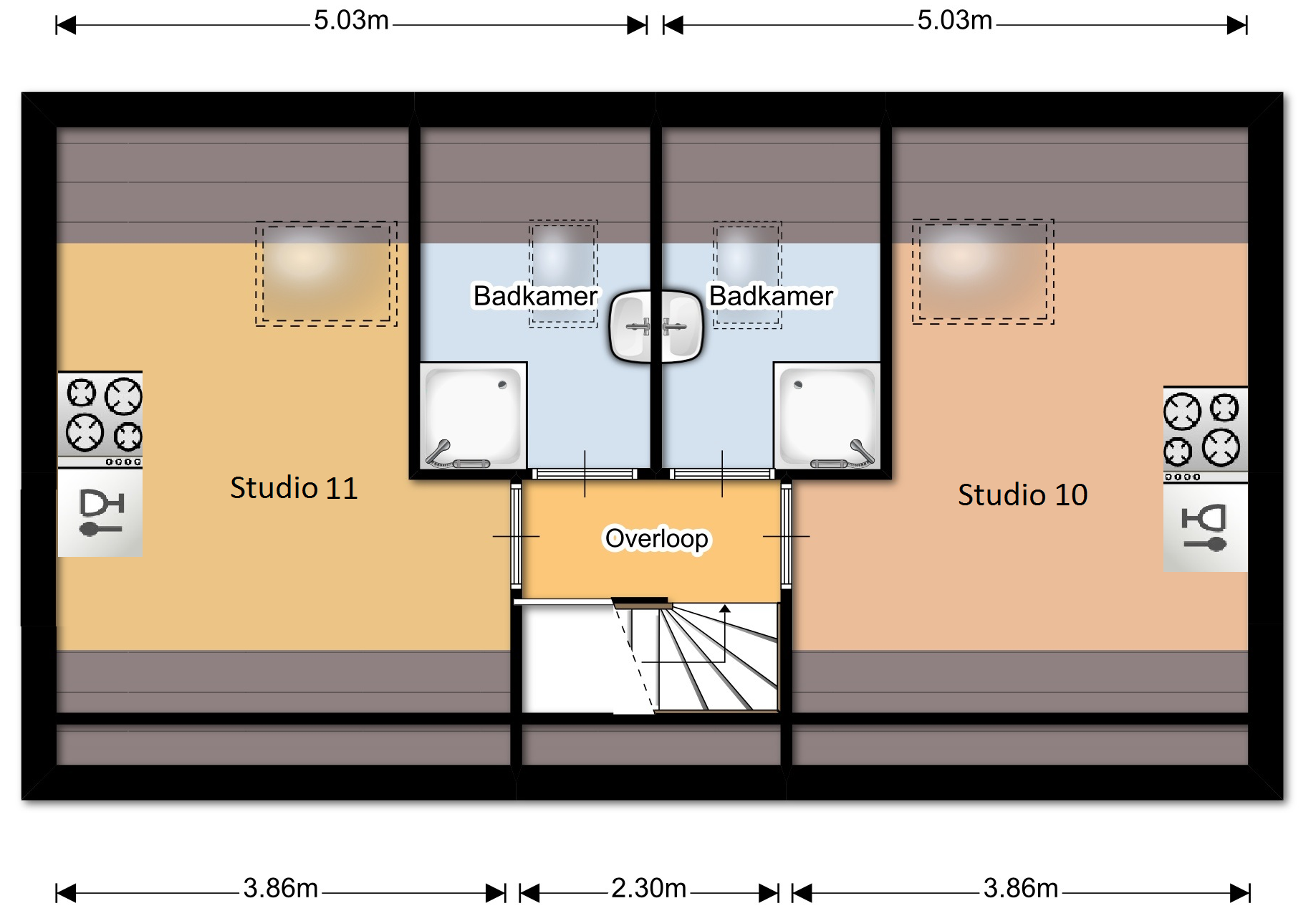 Studio’s 1 t/m 9. Overloop met gedeeld gebruik van 2 toiletten en 2 douches. Tweemaal gezamenlijke betegelde wasruimte voorzien van wasmachine en droger.