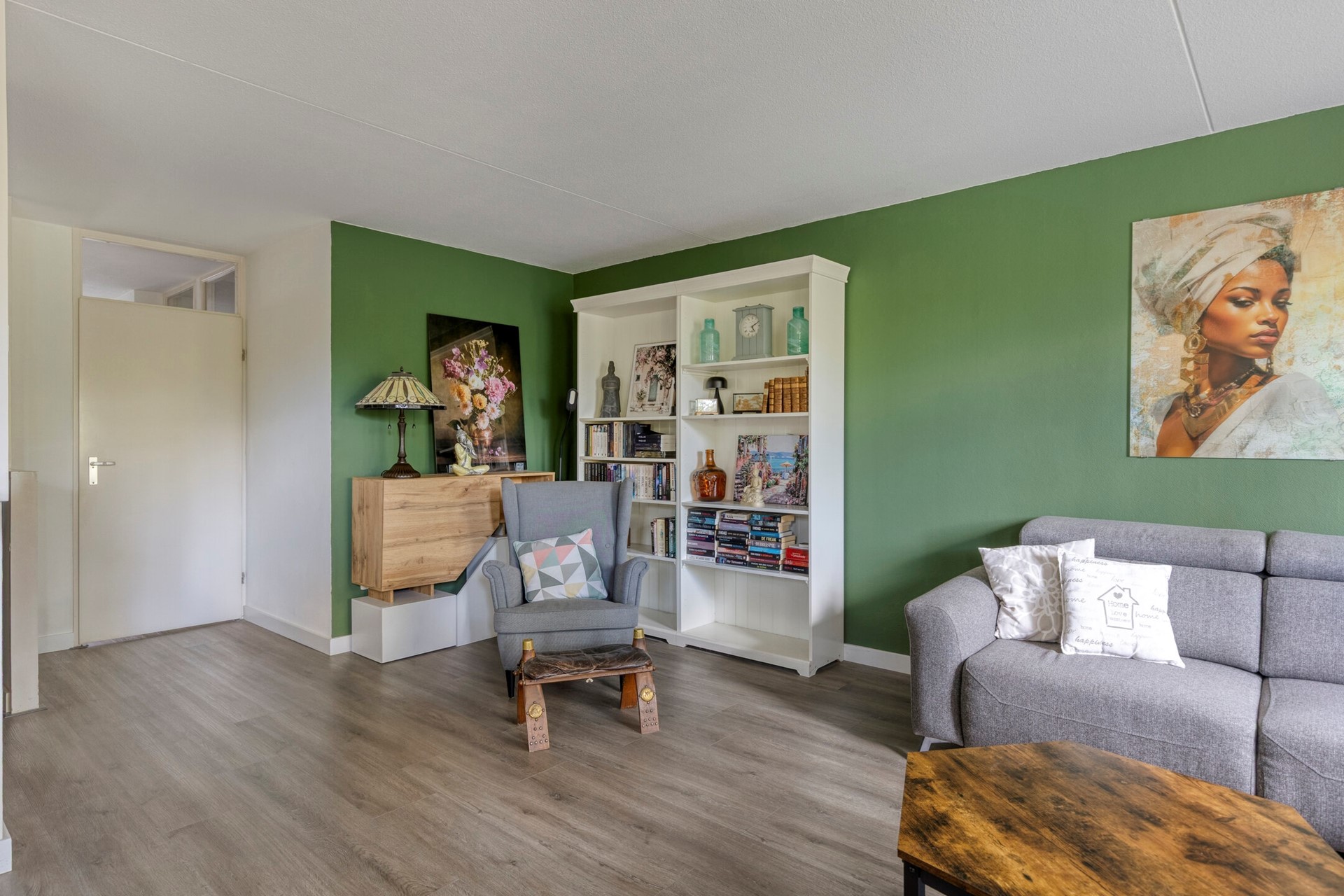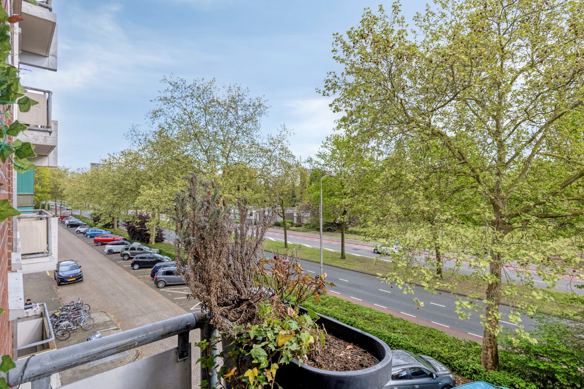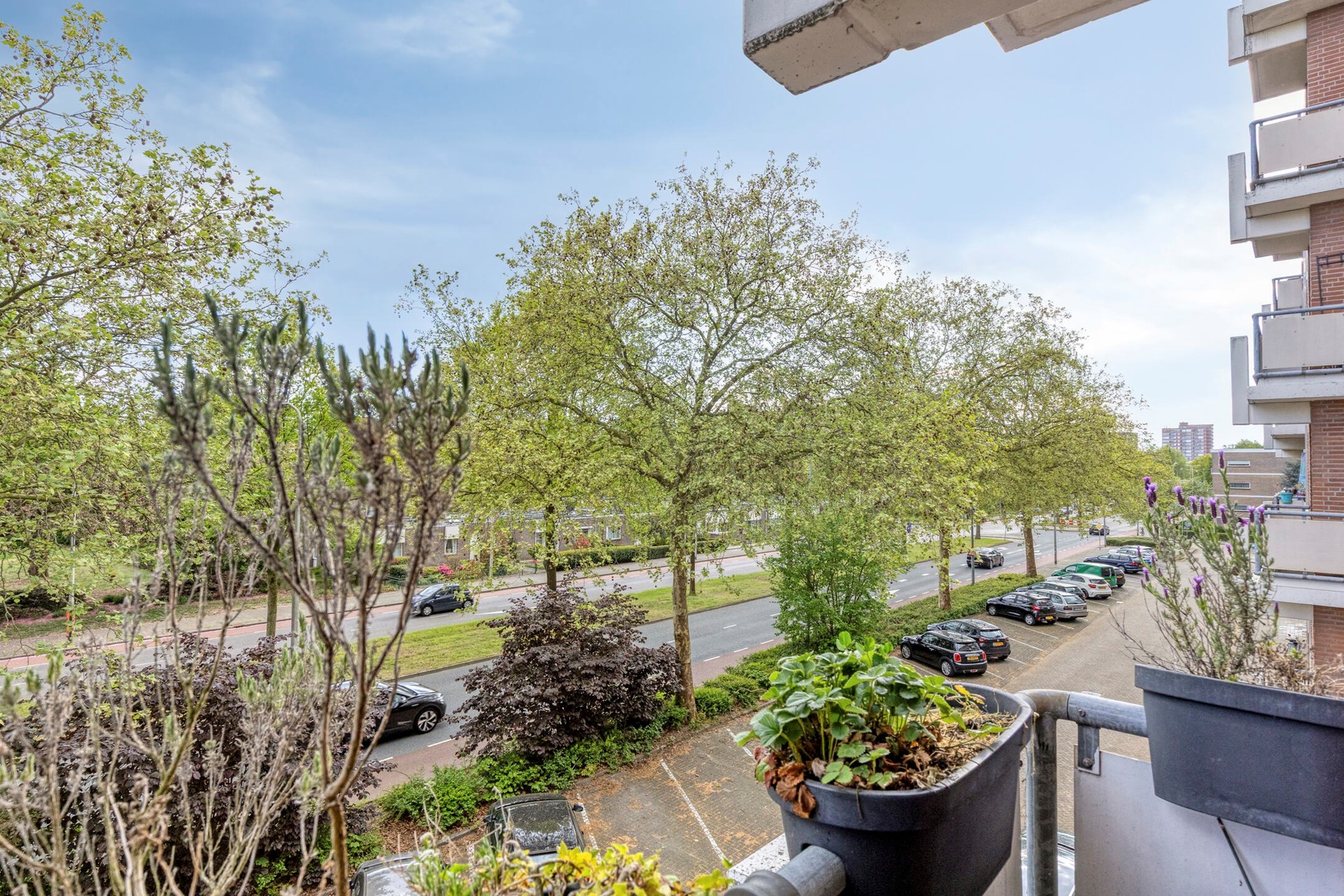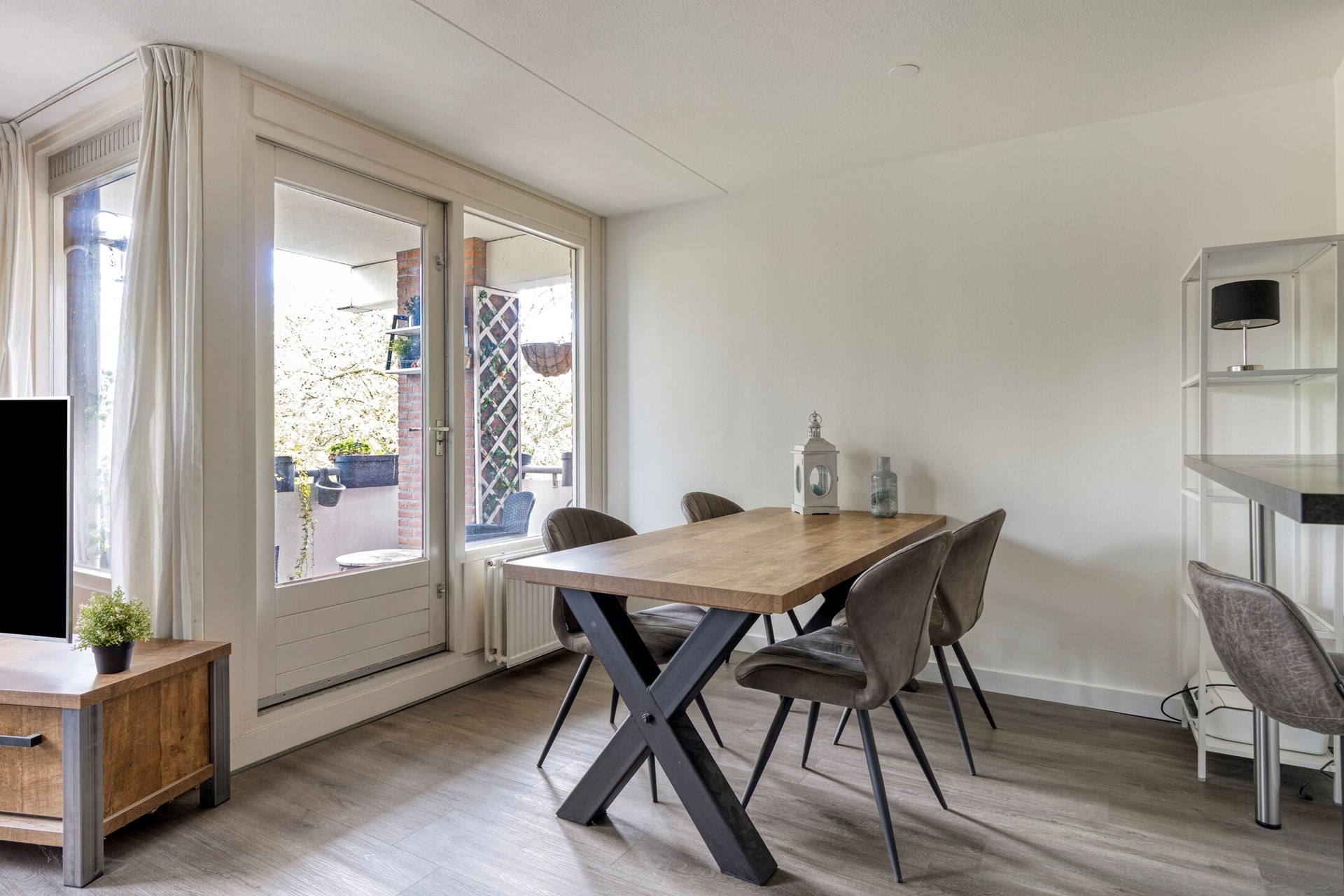 De woonkamer is licht en ruim opgezet, met grote raampartijen die zorgen voor een prettige hoeveelheid daglicht. Vanuit de woonkamer stap je zo het balkon op het zuidoosten op, waar je van ’s ochtends tot in de namiddag van de zon geniet. Het vrije uitzicht wordt extra bijzonder door het groene, beschermde parkje tegenover de woning, dat in de lente prachtig in bloei staat met bloesembomen.